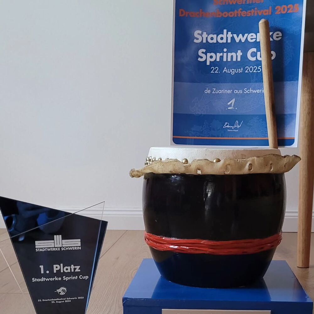 Am Freitag sind wir bereits beim Stadtwerke Sprint Cup an den Start gegangen. Es war ein erfolgreicher Start ins Wochenende. Beim Sprintcup konnten wir den 1. Platz erreichen. Und haben als Trophäe eine tolle Mini-Drachenboottrommel gewonnen.